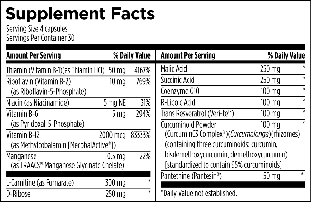 Optimal Energy includes CoQ10, Alpha Lipoic Acid, Pantethine, L-Carnitine, B Vitamins, Manganese, Ribose, Malic and Succinic Acids.