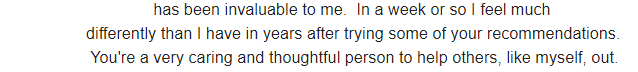 “I just want to say thanks for the consult. As you know, I have been on medication for a very long time for anxiety and depression, so your guidance is very helpful. I really liked the advice you provided and I will try the things you suggested. Thanks again.” - Tracy S.