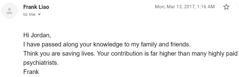 “Jordan is very informative and knowledgeable. I have battled mental illness and other illnesses. Having done my own extensive research and reading, I can attest to what Jordan shares as very accurate and truthful. He is ahead when it comes to doctors I have met. Well done, Jordan and thank you for all the hard work you do and all you share to help others.” - Rhonda M.